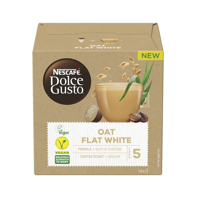 Discover NESCAFÉ® Dolce Gusto® Plant-based Oat Flat White and enjoy a specialty coffee beverage right at home! It begins with superior coffee, blended perfectly with lactose-free oat ingredients. You’ll love the Oat Flat White’s roasty notes with subtle toasted oat cereals.